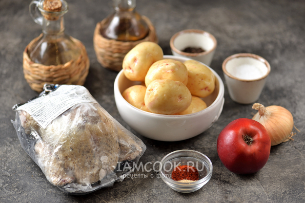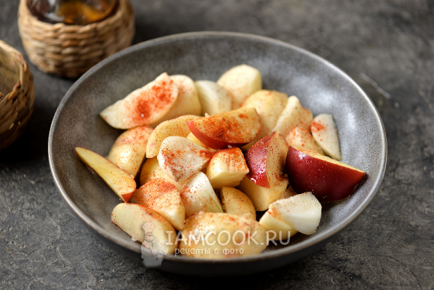 А пока очистите картофель, репчатый лук от кожуры и яблоко от семечек, нарежьте всё крупными ломтями, переложите в глубокую миску. Полейте оставшимся маслом, посыпьте оставшейся паприкой с чесноком и солью с перцем, тщательно все перемешайте.