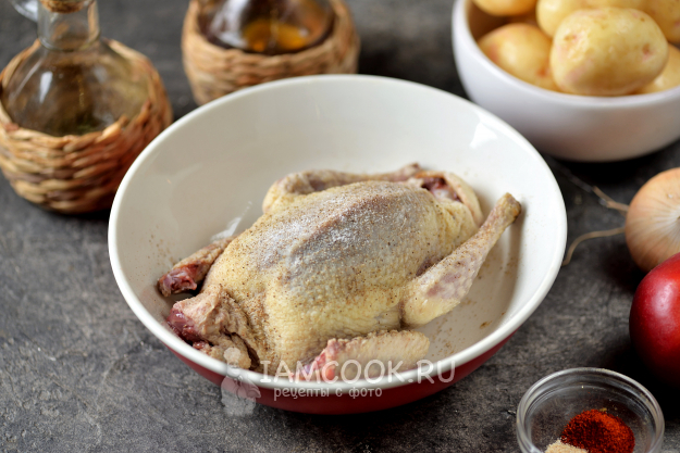 Спустя время промокните тушку бумажным полотенцем, переложите в глубокую миску, посыпьте солью, свежемолотым перцем.