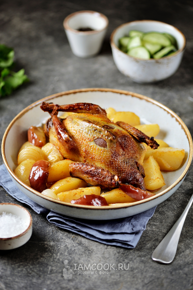 Спустя время аккуратно разрежьте рукав, выложите запеченного в духовке голубя на середину тарелки, по краям положите картофель с луком и дольками яблока и сразу же подавайте к столу. Правильно приготовленное мясо голубя получается очень вкусным, оно совсем не сухое и не имеет никакого постороннего запаха.