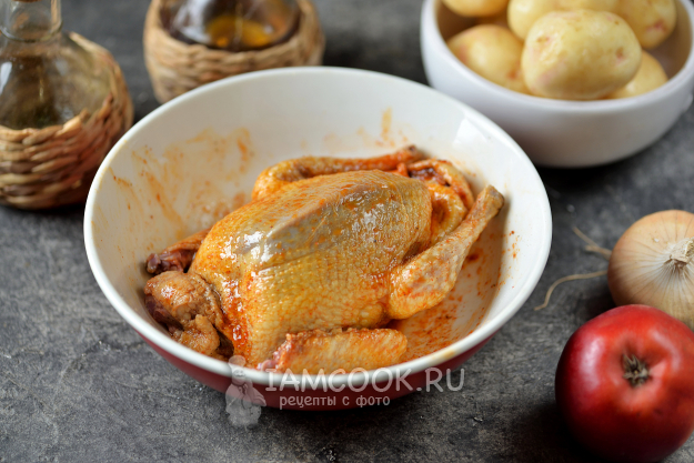 Подготовьте огнеупорную форму. Рукав для запекания завяжите с одной стороны, выложите в нее картошку с луком и яблоком, сверху положите тушку голубя. Пару крупных долек яблока вложите птице в брюшко.