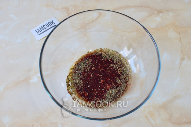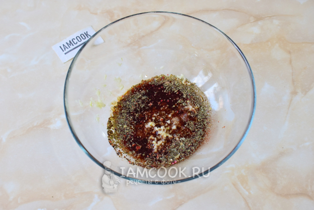 Для маринада налейте в чашу соевый соус. Добавьте к нему соль и специи. Учитывайте, что соевый соус сам по себе уже соленый. В качестве специй я беру смесь молотых перцев и сушеный базилик.
