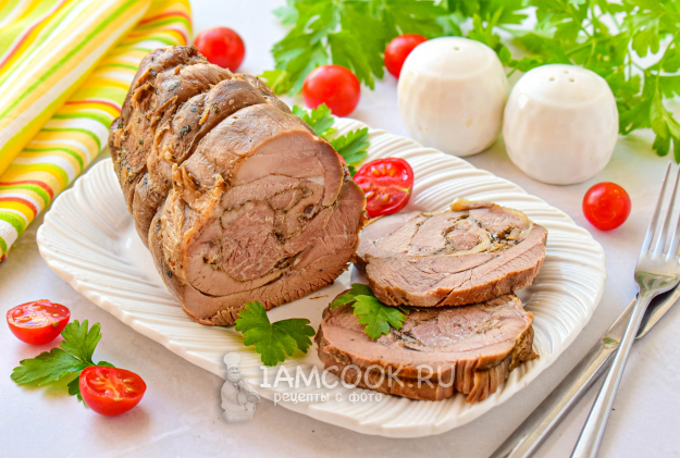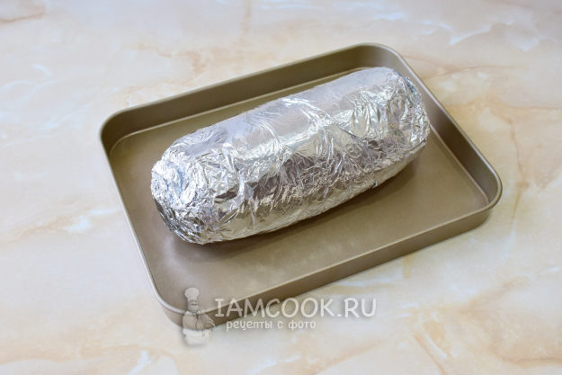 Затем оберните в несколько слоёв фольги. Выложите мясо на металлический противень и поставьте в духовку, разогретую до 180 градусов, на 1 час. Затем духовку выключите и оставьте мясо там до остывания. Затем, не разворачивая фольгу, уберите мясо в холодильник на ночь. Оно застынет и будет хорошо держать форму при нарезке.
