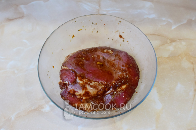 Мясо обмажьте получившимся маринадом со всех сторон. Оставьте мариноваться на несколько часов. Я оставила мясо на ночь в холодильнике. За это время мясо отлично пропитается.