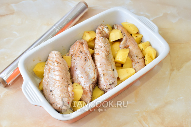 Для запекания крыльев индейки в духовке с картошкой можно взять любую жаропрочную форму. Смажьте её растительным маслом. Выложите в форму крылья и картофель. Закройте форму фольгой. Отправьте в духовку, предварительно нагретую до 190 градусов, на 1 час. Затем снимите лист фольги и оставьте форму в духовке еще минут на 15, чтобы крылья подрумянились.