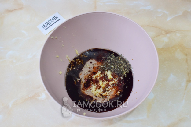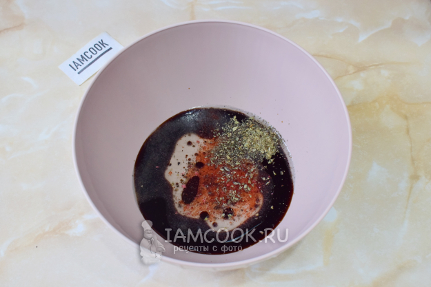 Приготовим маринад. Влейте в миску соевый соус и растительное масло. Подсыпьте соль. Учитывайте, что соевый соус уже соленый. Специи выбирайте по своему предпочтению. Я добавляю ароматный сушеный базилик и паприку.
