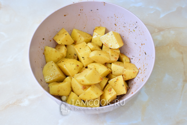Перед запеканием крылья извлеките из маринада. В эту же чашу выложите очищенный картофель, нарезанный крупными кусочками. Перемешайте с остатками маринада.