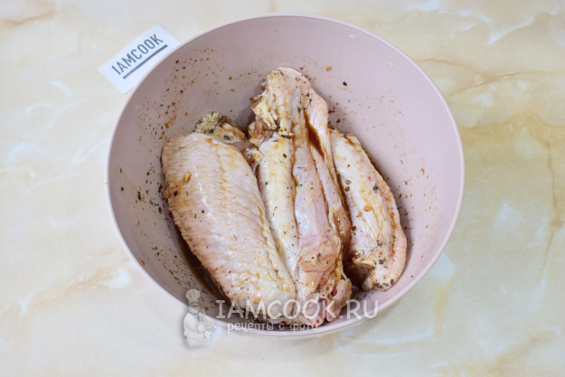 Крылья индейки отправьте в маринад. Обмажьте их со всех сторон. Оставьте постоять на 2-3 часа, чтобы они промариновались.
