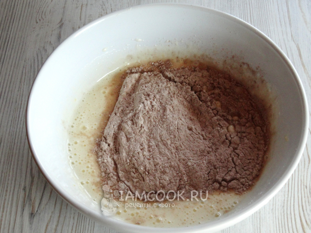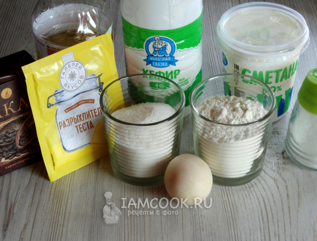 Возьмите всё, что необходимо для приготовления шоколадного кекса на кефире и сметане.