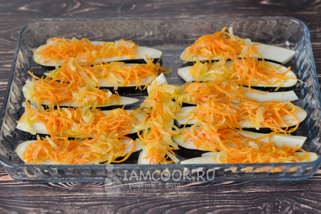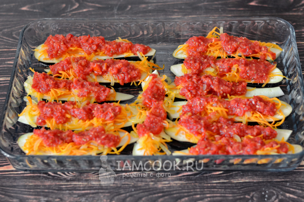На каждый язычок поверх лука и моркови ложкой выложите соус из помидоров.