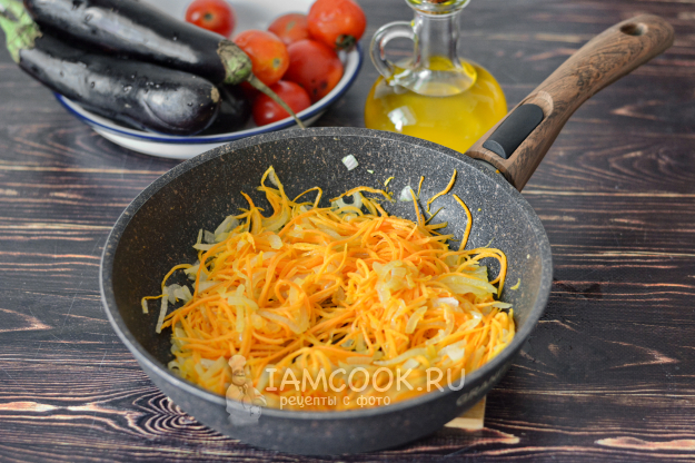 Лук нарежьте полукольцами, морковь натрите на корейской тёрке и обжарьте их на сковороде на разогретом масле до прозрачности.
