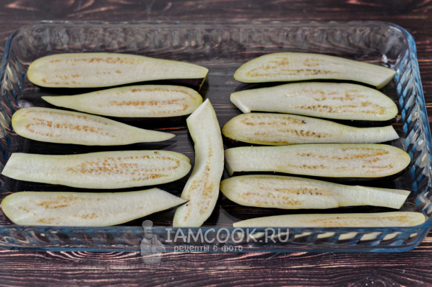 У баклажанов отрежьте хвостики и нарежьте их вдоль язычками толщиной 1 см. Выложите язычки из баклажанов на противень и немного посолите.