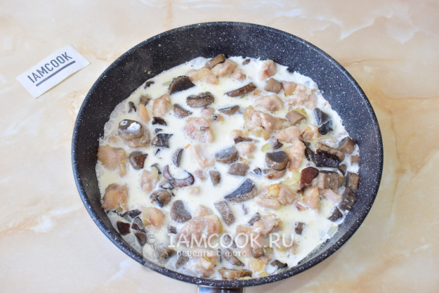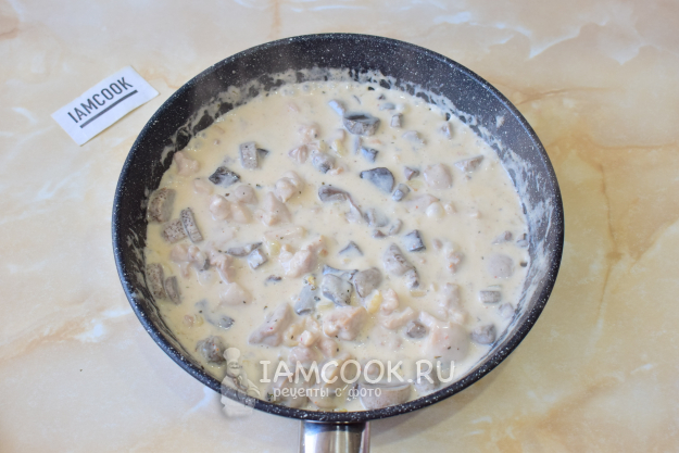 Залейте сливками и доведите до кипения. Помешивайте. За счет добавленной муки соус станет приятной густоты. Чтобы было больше соуса, можно подлить больше сливок или немного воды.