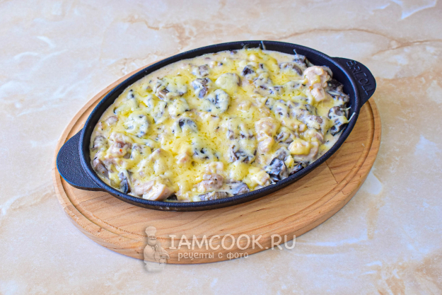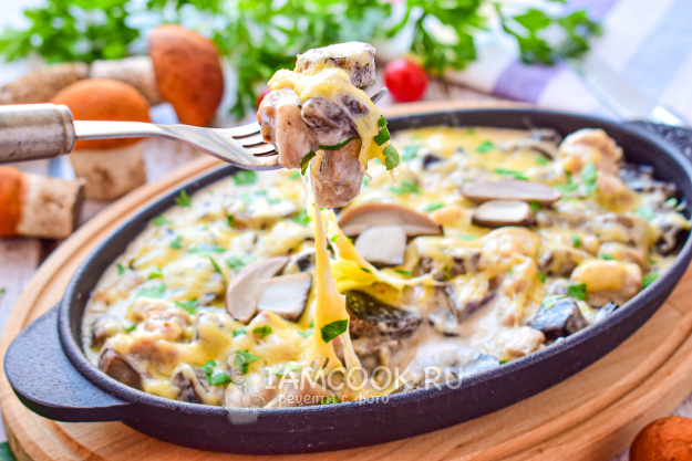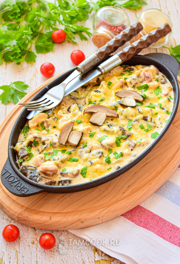 За это время сыр полностью расплавился. Извлеките жульен с курицей и подосиновиками из духовки и сразу подавайте к столу.