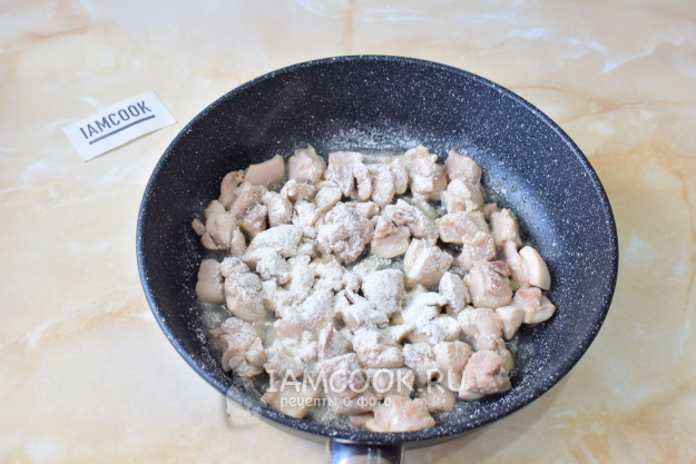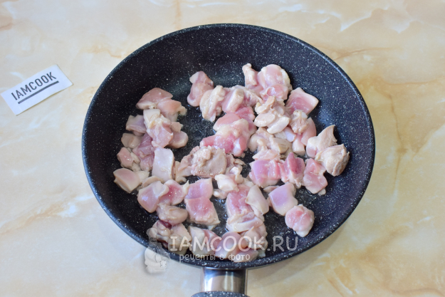 На другой сковороде обжарьте 7-10 минут курицу, нарезанную на кусочки.