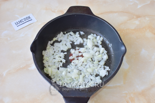 Для приготовления жульена очистите, мелко нарежьте и обжарьте 1-2 минуты лук.