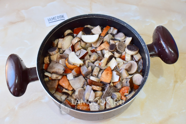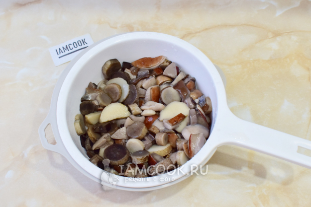 Затем откиньте грибы на дуршлаг, промойте холодной водой и оставьте постоять.