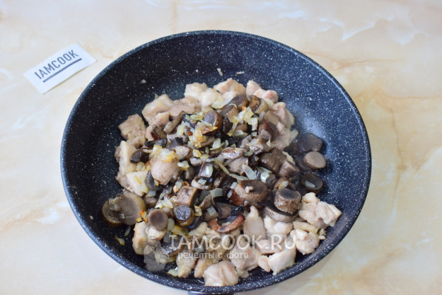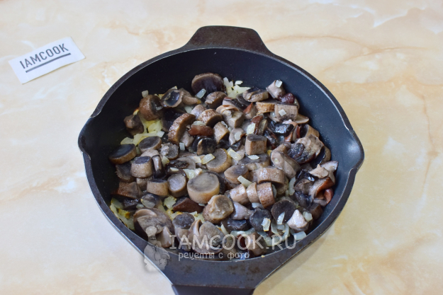 Добавьте к нему отварные грибы. Жарьте их с луком 5-7 минут, чтобы выпарилась лишняя влага с грибов. Немного подсолите.