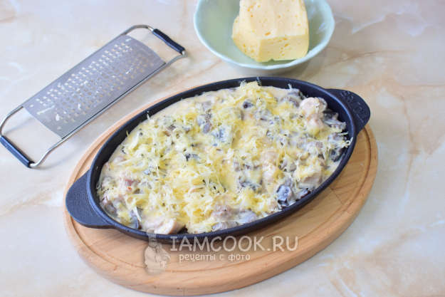 Теперь жульен можно сделать разными способами. Можно посыпать сразу в сковороде сыром. Можно разложить по кокотницам или в порционные сковородки. Посыпаем верх сыром и ставим в духовку при 180 градусах на 5-7 минут.
