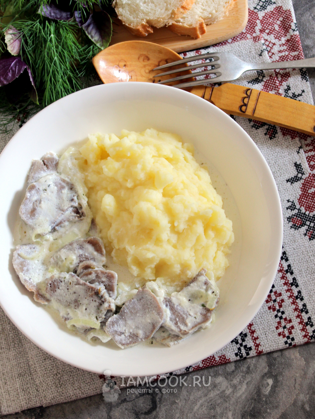 Подавала свиной язык в ароматном сливочном соусе к плотному картофельному пюре.
