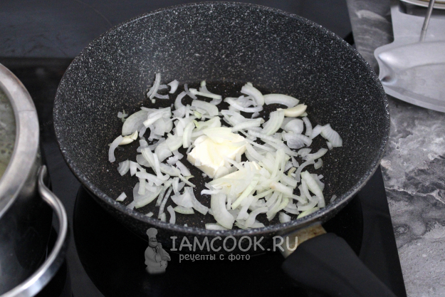 Смажьте сковороду растительным маслом. Лук тонко нашинкуйте полукольцами, кубиком или иначе. Уложите на сковороду, слегка посолите, добавьте кусочек сливочного масла, по желанию сопроводите раздавленным зубчиком языка. Потомите лук до мягкости и прозрачности в сливочном масле на среднем огне при помешивании 12-15 минут.
