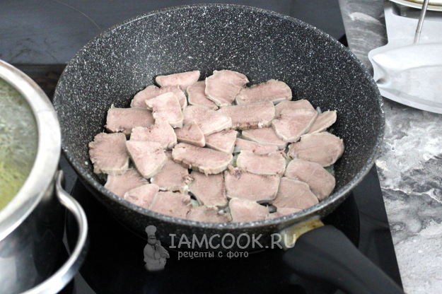 Язык нарежьте ломтиками или соломкой и отправьте на сковороду с луком, потомите всё вместе на слабом огне минут 5.