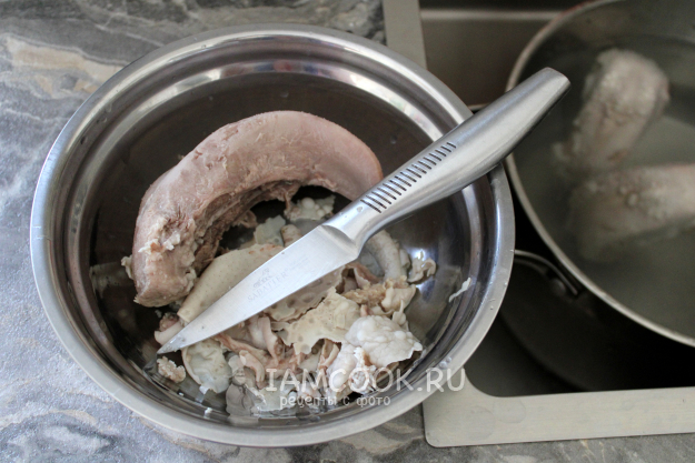 Сварите свиные языки. Для этого первую воду после закипания и варки языков в течение считанных минут слейте. Затем поместите их в свежую горячую воду, доведите до кипения, убавьте огонь до слабого и варите под крышкой до 2 часов. Например, в мультиварке на режиме «Тушение 2 часа». По желанию добавьте в воду для варки свиных языков один лавровый лист и 3-4 горошины душистого перца. В конце посолите.
