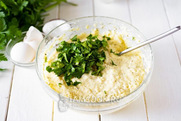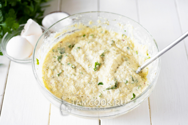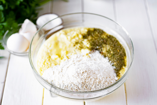 Измельченную картофельную массу из чаши чоппера выложим в миску, добавим муку, хмели-сунели, соль. Перемешаем.