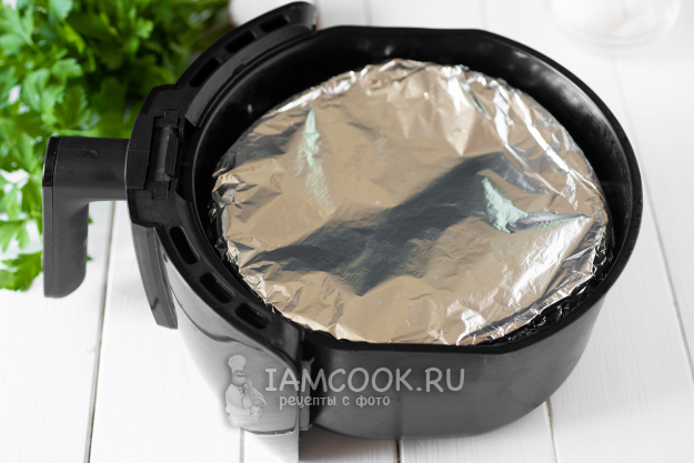 Форму накроем листом фольги (для равномерного запекания) и поместим в чашу аэрогриля. Чашу поставим в аэрогриль. Установим температуру на 200 градусов и готовим картофельную запеканку в аэрогриле 30 минут, затем снимем с формы лист фольги и продолжим дальше запекать - еще 30 минут. В общей сложности готовим запеканку в течение часа.