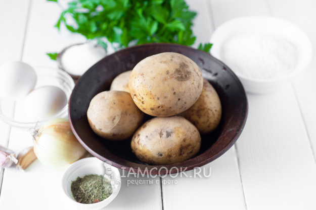 Соберём необходимые ингредиенты для приготовления картофельной запеканки в аэрогриле. Картофель почистим и помоем. Лук репчатый, чеснок почистим. Свежую зелень ополоснем.
