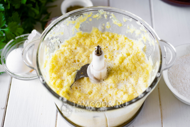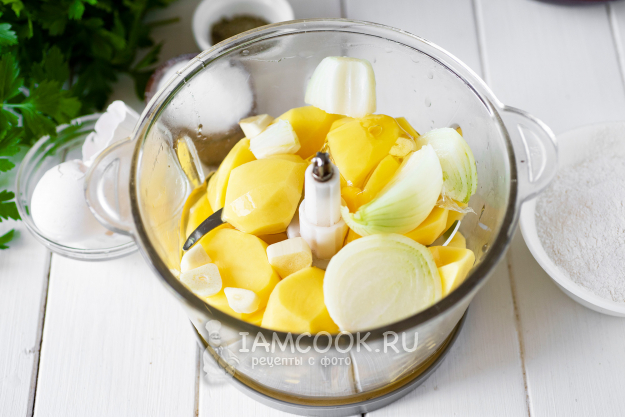 В чашу чоппера (блендера) выложим картофель, нарезанный небольшими кусочками, также выложим лук и чеснок, нарезав их произвольными кусочками, вобьем яйца.
