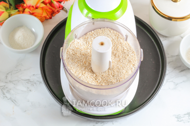 Первым делом всыпьте овсяные хлопья быстрого приготовления в измельчитель и пробейте не до муки, а до мелкой крошки.