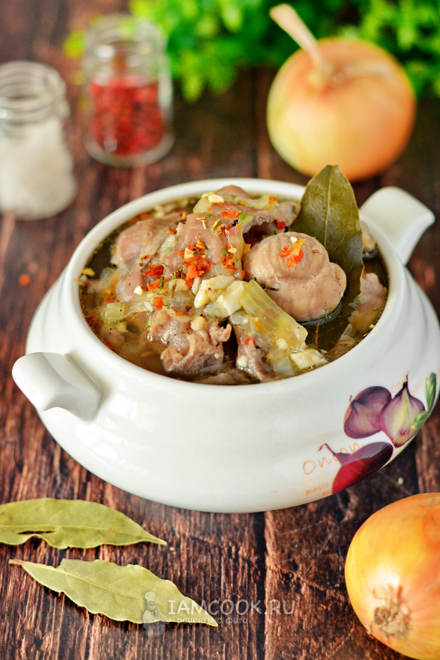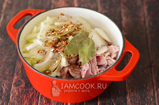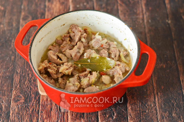 Сложите в казан (кастрюлю) подготовленные желудки, добавьте нарезанный лук, соль, приправу для мяса и лавровые листочки. Влейте немного воды и доведите до кипения.