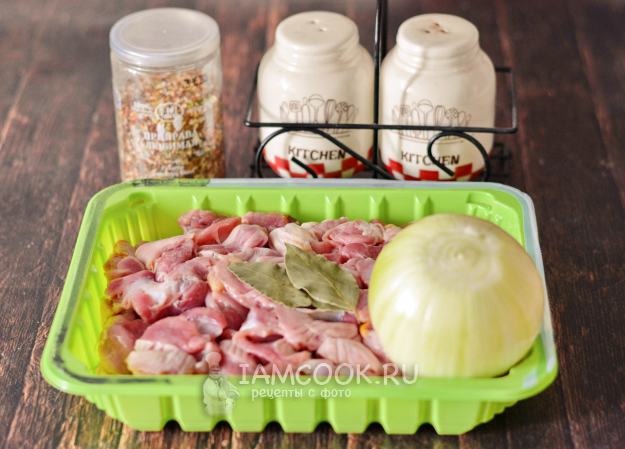 Соберите все необходимые продукты для приготовления тушёных куриных желудков с луком. Лука должно быть много - примерно 2/3 от веса желудочков.