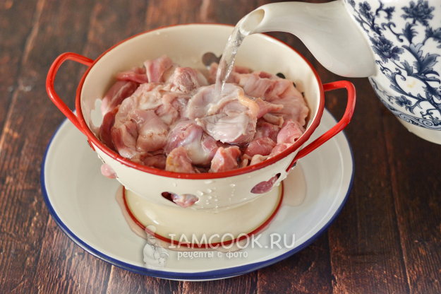 Во-вторых, тщательно промойте куриные желудки под холодной проточной водой.