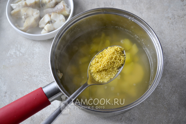 Кусочки минтая достаньте из кастрюли, положите некрупно нарезанный картофель и пшено. Доведите до кипения, уменьшите огонь и варите почти до готовности продуктов. Посолите.