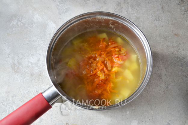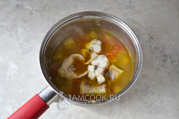 Положите кусочки рыбы в кастрюлю. Проварите еще 5-6 минут после того, как суп закипит.