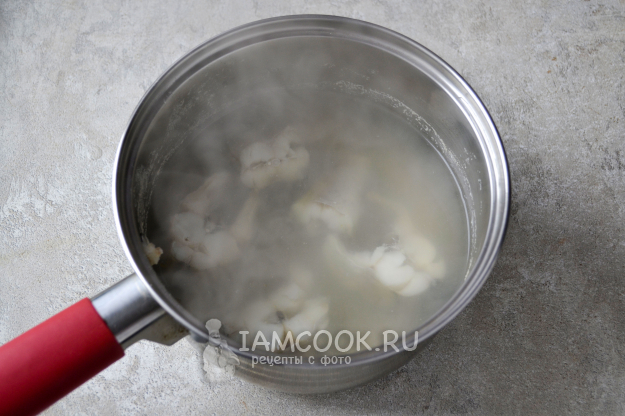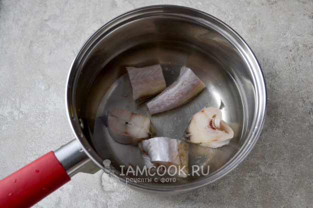 Отрежьте у минтая плавники и хвост. Разрежьте на порционные кусочки, положите в кастрюлю, влейте воду, посолите и поставьте на огонь.