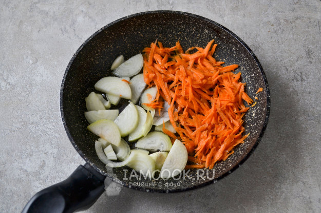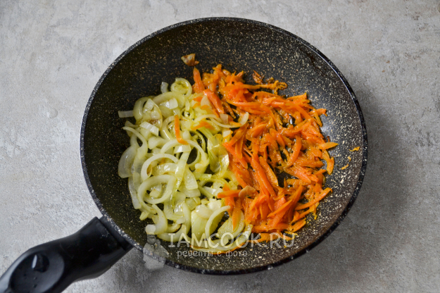 Натрите на крупной терке очищенную морковь и нарежьте лук полукольцами. Положите овощи на хорошо разогретую с растительным маслом сковороду.