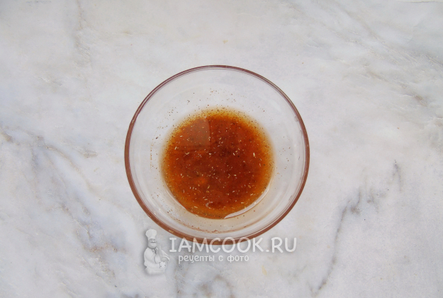 Приготовьте маринад. В мисочку налейте растительное масло и уксус. Добавьте соль и специи, измельченный чеснок, перемешайте.