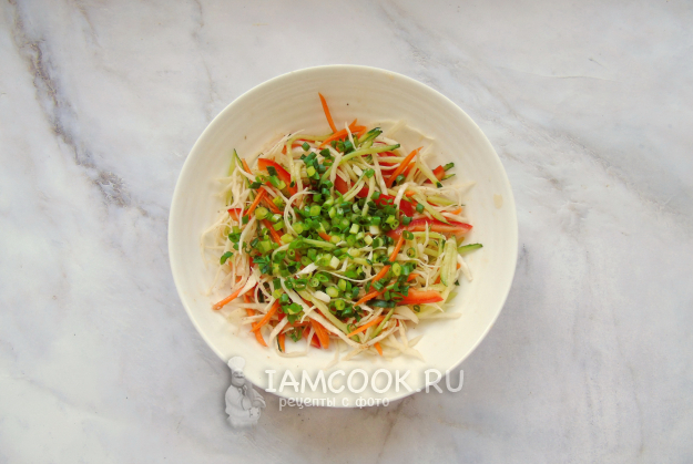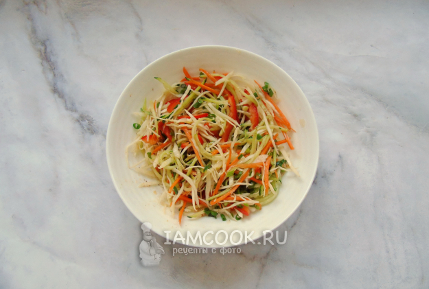 Заправьте салат маринадом, перемешайте и поставьте в холод на 2 часа.