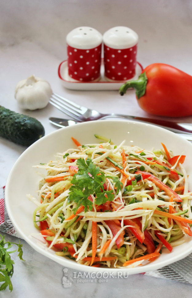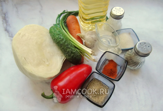 Соберите ингредиенты для приготовления салата чап-ча из капусты, сладкого перца и огурца.