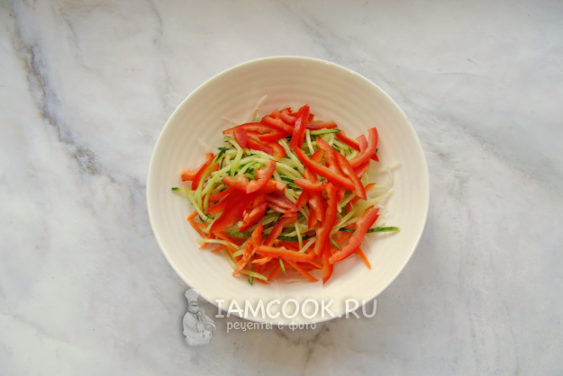 Болгарский перец очистите от семян, помойте и нарежьте соломкой.