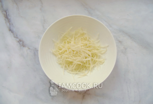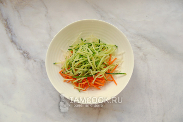 Огурец помойте и нарежьте соломкой или натрите на той же терке.