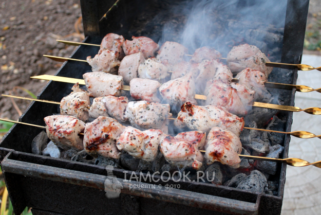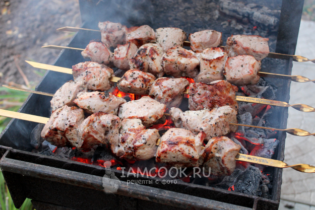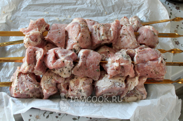 Посолите замаринованные куски свинины либо в конце маринования, перемешав соль с маринадом, либо когда мясо будет уже на шампурах. Не насаживайте куски на шампур плотно друг к другу, пусть между ними останется небольшое расстояние. Думаю, что в этом случае будет лучше нагреваться шампур и жарить мясо ещё и изнутри, сокращая время приготовления.