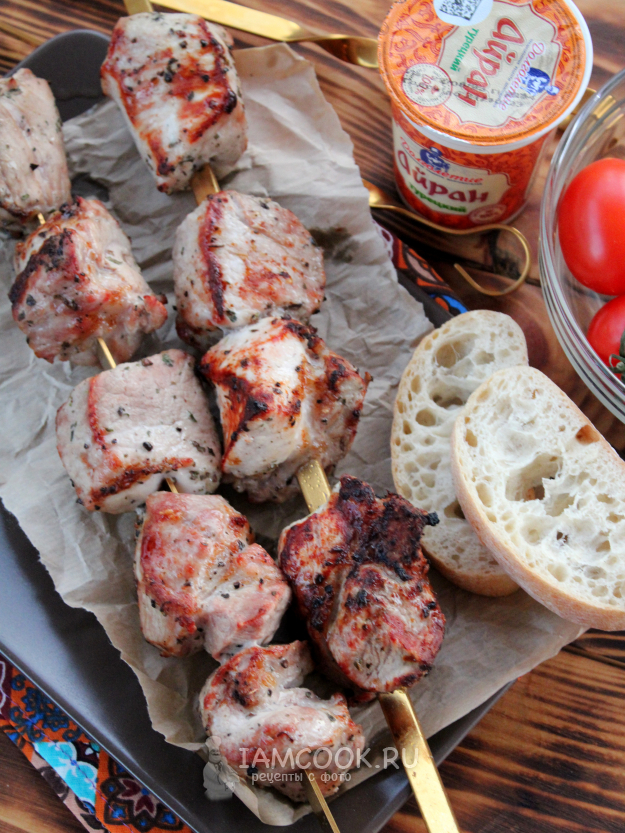 Подавайте шашлык из свинины на айране со свежими овощами, маринованным луком и соусами по вкусу.