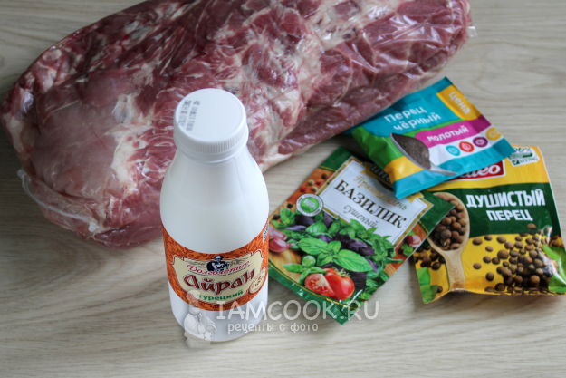 Для приготовления шашлыка из свинины на айране соберите ингредиенты по списку к рецепту.