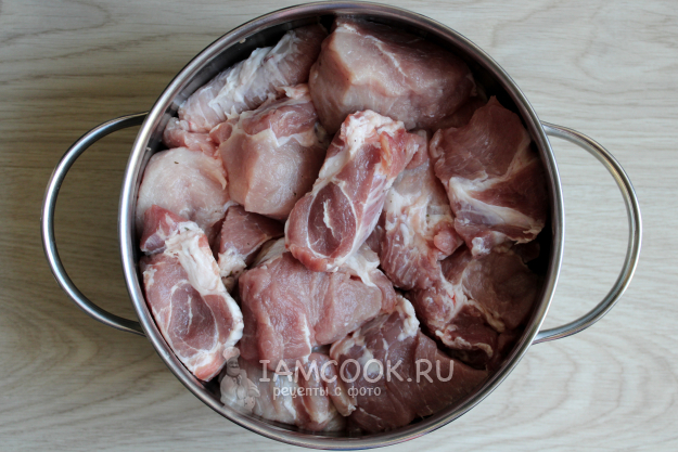 Свинину нарежьте на куски. Их размер может варьироваться, кто к каким привык.