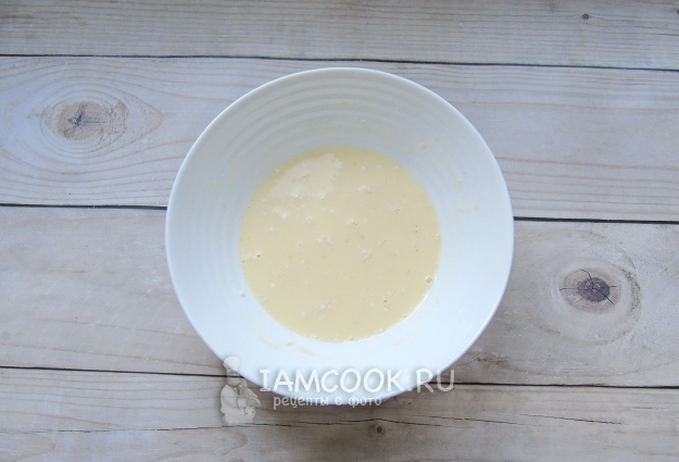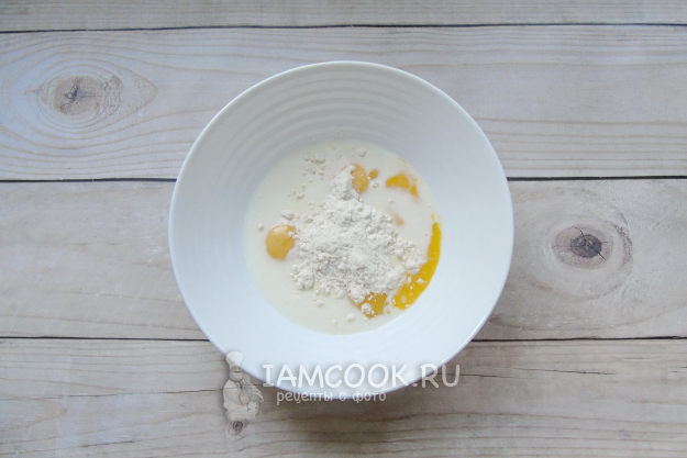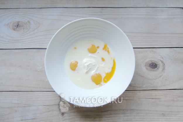 Выложите белки в миску с желтками, молоком, сметаной и мукой.