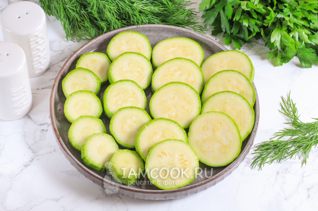 Небольшие кабачки или один кабачок промойте в воде и срежьте хвостики с обеих сторон плода. Нарежьте кружочками примерно по 1 см толщиной.