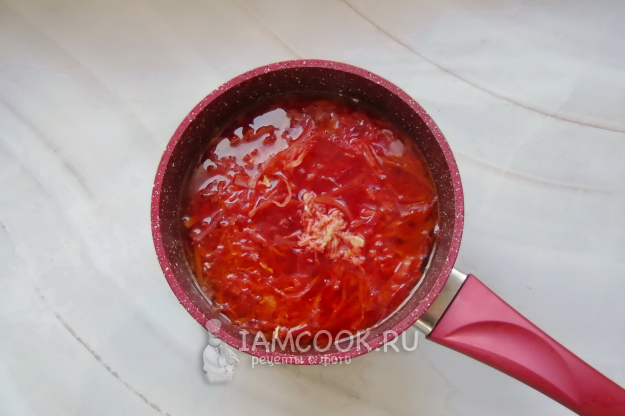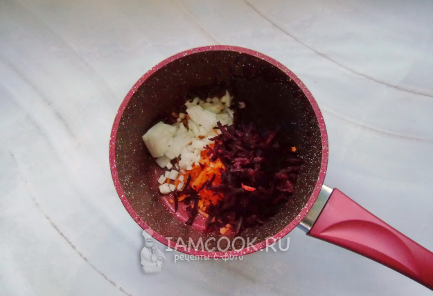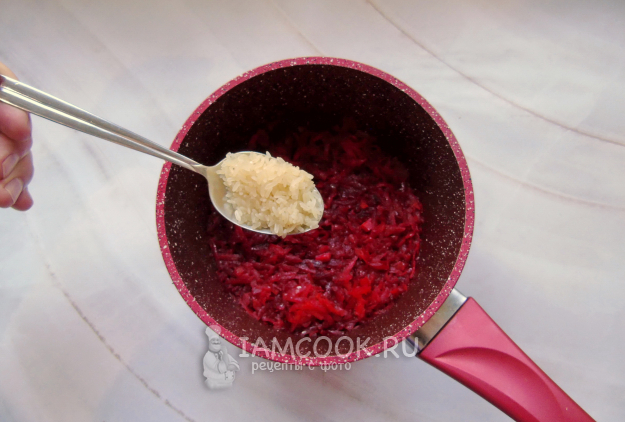 Свеклу очистите, помойте и натрите на терке. Добавьте в кастрюлю.